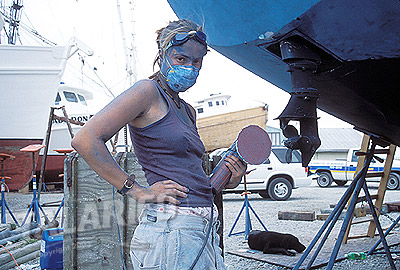Woman sanding boat hull, saltwater craft maintence, repair, Beaufort, North Carolina.